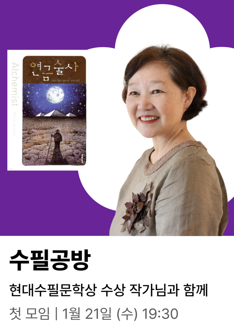 우리가 글을 쓸 때는 언제나 마음의 목소리에 귀 기울이게 됩니다. <연금술사>는 그런 마음의 목소리를 듣고 보물을 찾아 떠나는 주인공의 이야기예요. 수필공방에서 멤버들이 마음의 목소리에 따라 보물을 찾아가시길 바랍니다 :)