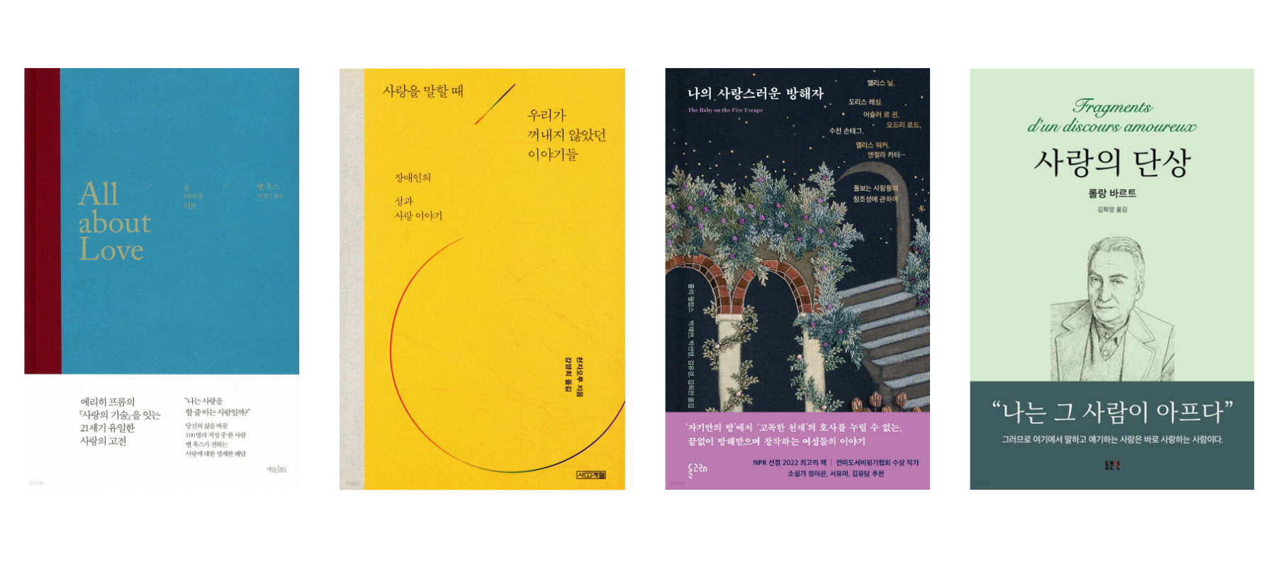 첫 번째 책 『올 어바웃 러브』는 사랑을 막연한 감정이 아닌 ‘성장을 위한 실천적 의지’로 새롭게 정의하며 대화의 문을 엽니다. 이어 대만 작가 천자오루의 『사랑을 말할 때 우리가 꺼내지 않았던 이야기들』을 통해 그간 사회적으로 소외되었던 장애인의 욕망과 사랑을 정면으로 응시해봅니다. 세 번째 책 『나의 사랑스러운 방해자』에서는 돌봄과 창조성 사이의 치열한 분투를 목격하고, 마지막으로 롤랑 바르트의 『사랑의 단상』에 담긴 언어의 파편들을 따라가며 사랑에 빠진 주체의 심리와 그 기호를 추적합니다.
