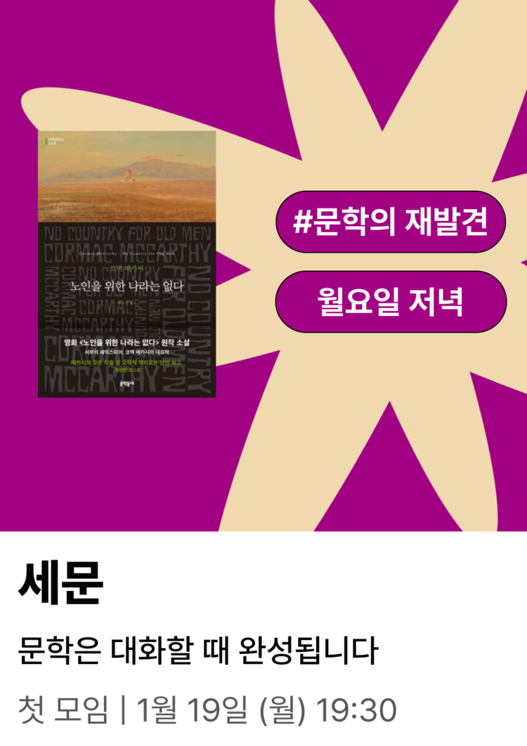 매카시는 인간다운 품위와 존엄을 독자에게 다시 묻습니다. 세문 멤버들과는 어떤 이야기를 나눌 수 있을까요? 변화하는 세계에서 ‘선한 사람’은 어떻게 살아남는지, 우리는 무엇을 잃었고, 무엇을 잃어가는 중인지 함께 이야기 나누어 보아요. 도덕이 더는 기준이 되지 못할 때, 인간성은 어떤 모습으로 남는지에 대한 깊은 이야기를 나누어 보아요.
