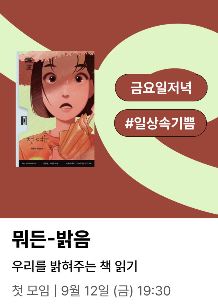 ‘밝음’이라는 단어엔 따스함, 여유, 에너지가 담겨 있다고 생각해요. 우리의 이야기에도 그런 밝음이 자연스럽게 스며들기를 바라며, 같이 읽고 나누고 웃을 여러분을 기다립니다 :) 금요일 하루의 끝에 무겁지 않지만 그리 가볍지도 않은 책 한 권을 두고 유쾌한 문장에 웃고 따뜻한 대화에 마음을 기대는 시간을 가져봅시다 . 깊으면서도 재미있는 대화를 나누고 나면, 여러분의 일상에 스쳐가는 밝음들을 더 쉽게 발견할 수 있을지도 몰라요✨!